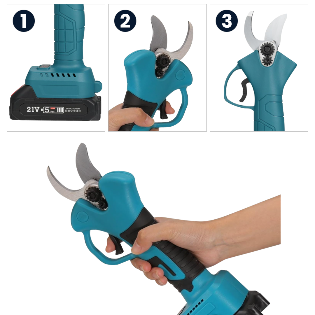 Foarfeca electrică cu acumulator are o gamă largă de utilizări: poate fi folosită în grădină, parc, fermă, grădină de legume și seră. La contactul cu ramuri relativ mari sau dure, foarfeca electrică asigură o tăiere continuă. În acest stadiu, ramurile pot fi tăiate în diagonală pentru a ușura munca. Este interzis să atingeți lama cu mâinile cât timp instrumentul este pornit.